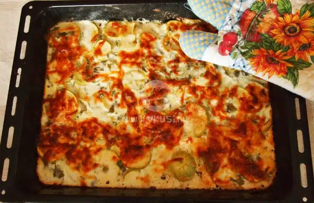 Прави се заливка от разбитите яйца, мляко, брашно, като в нея се добавят копър и чесън. Залятите тиквички се пекат в умерена фурна до зачервяване. След това се поръсват с настъргания кашкавал и малки бучки от маслото и се запичат отново.
