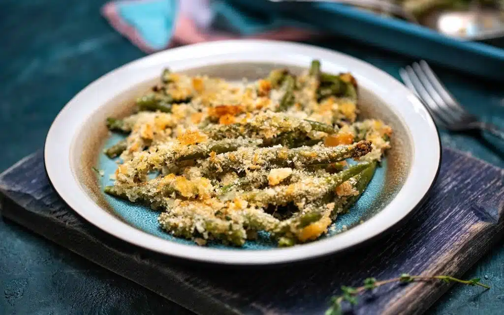 Потопете размразения зелен фасул в кипяща подсолена вода за 2–3 минути. Отцедете го.