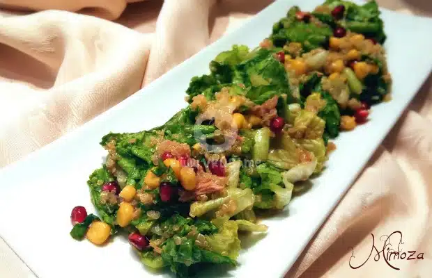 Салата се почиства и накъсва. Към нея се прибавят киноата, рибата тон, царевицата и зърната от нар.