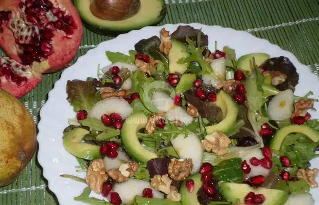 Смесете зелените салати и ги разпределете в чиния. Отгоре подредете парчетата круша и авокадо. Посипете зърната нар и ореховите ядки. Полейте салатата със зехтин, балсамов оцет и мед. Подправете с щипка сол за баланс.