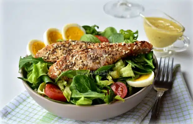Сложете зелениите в дълбока чиния, добавете нарязаното яйце на колелца и разполовените домати. Добавете рибните филета. Поднесете с дресинга.