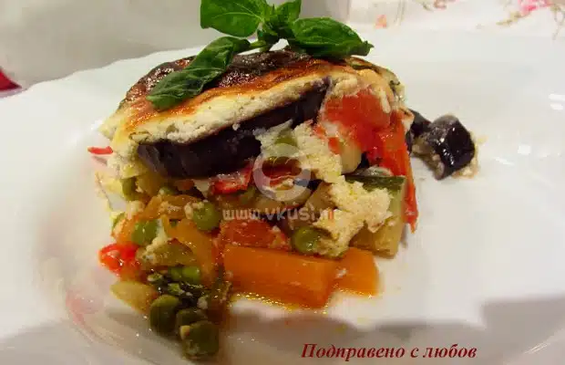 Подредете един ред патладжани на дъното на леко намаслена тавичка, в която ще печете ястието. Отгоре разпределете зеленчуковата смес. Върху нея подредете втори пласт патладжани. Върху патладжаните подредете люспите пармезан и накъсаните листа от пресния босилек.