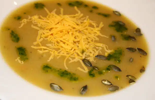 Супата сервираме, гарнирана с малко от магданозеното олио, печените семки и настърган пармезан.