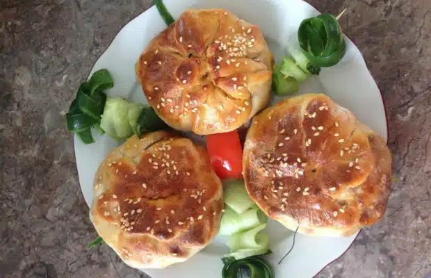 Готовото тесто се нарязва на топчета и се разточва с големина на чиния за сервиране. В средата на всеки кръгъл лист слагаме 2-3 с.л. от вече готовата смес. Хващат се краищата на тестото и се вдигат над сместа като се завързват с конец, за да не излезе плънката. Готовите кесийки се намазват с предварително разбит жълтък с малко олио към него и се поръсват със сусам. Печем в предварително загрята фурна около 160⁰ до приятен златист цвят.