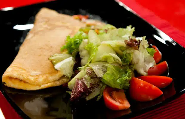 Сервираме омлета, като от едната страна сипваме зеленчуците и го прегъваме, отстрани нареждаме доматчета и салатата.