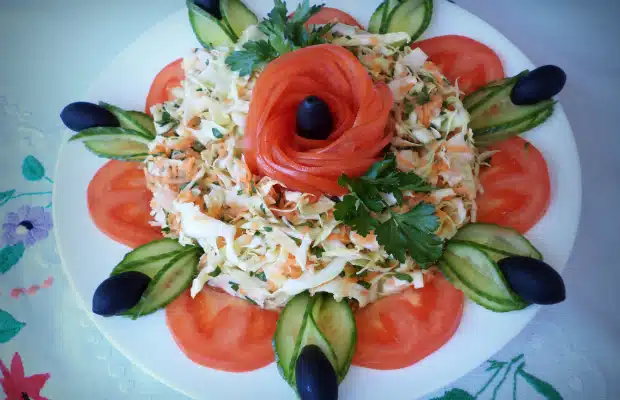 Салатата се изсипва в плато. Украсява се с домат, краставица и маслини, така както е на снимките. Добър апетит!