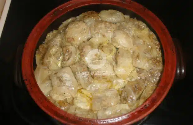 Към тях се добавя 3 ч.ч. вода, като една от тях може да бъде и от зелевата чорба. Много е важно водата да покрие чинията. Сармите се варят около 2 часа на бавен огън.
