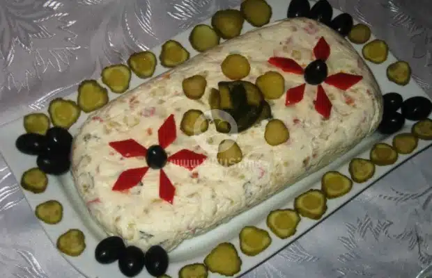 Разтворете желатина в малко от изстиналия бульон, оставете го да набъбне. Разтворете го на водна баня и заедно с останалия бульон го смесете с продуктите. Извадете и разстелете сместа върху фолио на правоъгълник.
