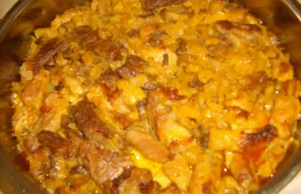 Изваждаме тавата, настъргваме кашкавала и отгоре разпределяме свинското месо с гъбите и лука. Връща се във фурната и запичаме още 15 мин. само отгоре. Вкусно зимно ястие с чаша домашно вино е супер!
