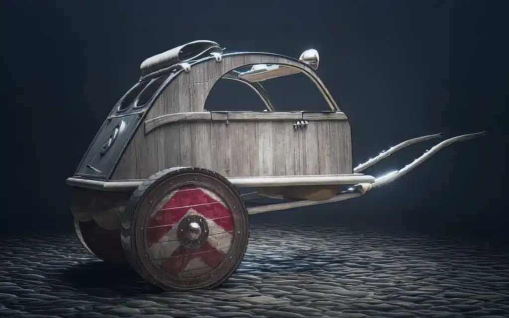 Превозното средство на Астерикс е с дъбова конструкция и изключително еко: колелата са от „рециклирани щитове“, пневматичното окачване се състои от кожени топки, емблемата с двата шеврона получава антична интерпретация, а фаровете са съставени от десетки светулки.